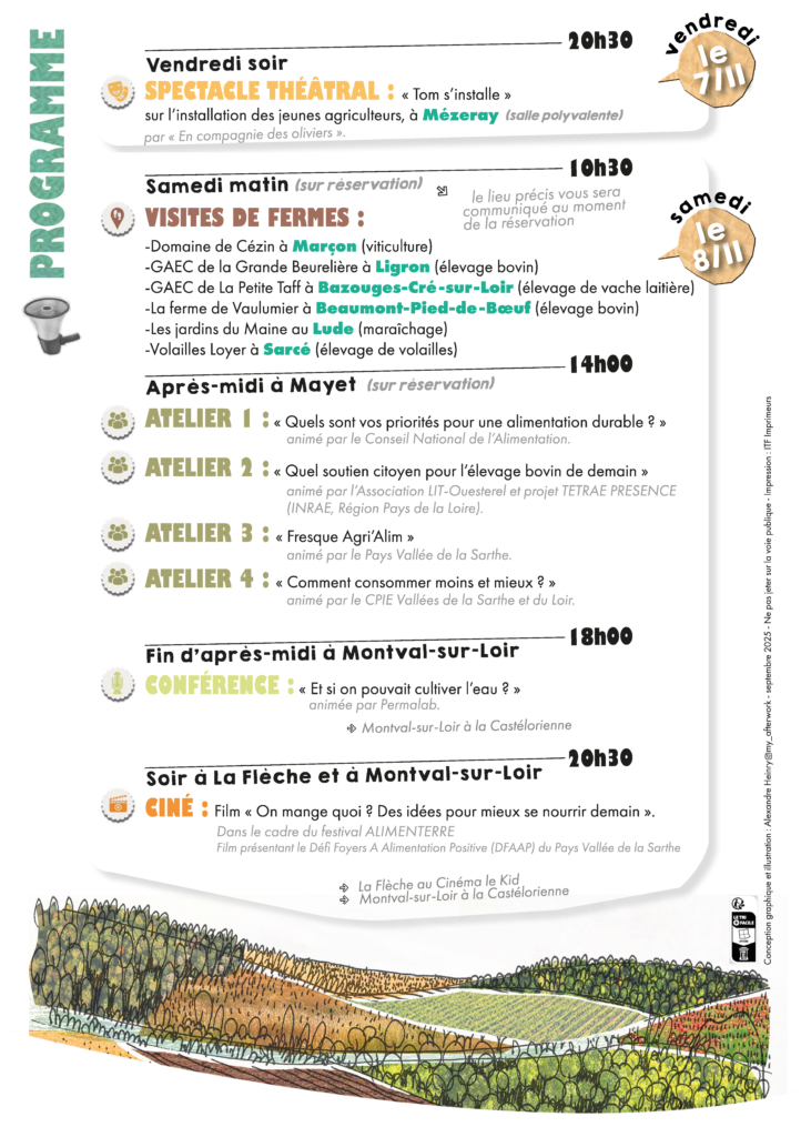 Le projet alimentaire territorial (PAT) de la Vallée du Loir vous invite les 7 et 8 novembre 2025 à 2 jours d’échanges, de découvertes et de réflexions autour de l’alimentation durable lors de son 1er évènement citoyen ! Un évènement pour tous ceux qui souhaitent s’impliquer dans une alimentation plus durable et locale.